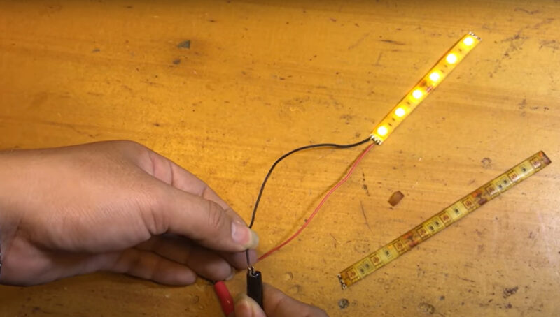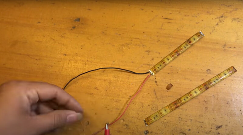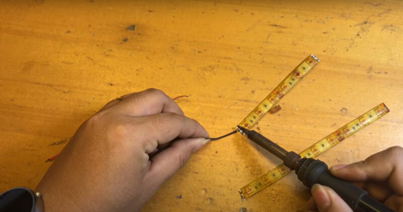 4. Sau khi phần thiếc tan chảy, giữ cố định hai đầu dải LED đến khi chúng nguội và cứng lại là bạn đã hoàn thành.