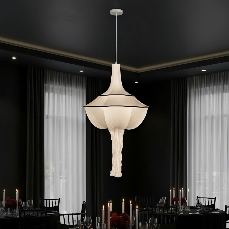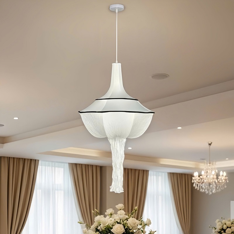 Thiết kế hình chuông mở rộng, tạo cảm giác mềm mại và duyên dáng. Lớp vải hoặc chất liệu tương tự màu trắng ngà không chỉ khuếch tán ánh sáng ấm áp mà còn mang lại vẻ đẹp thanh lịch và tinh khôi, rất hợp với không gian tiệc cưới.