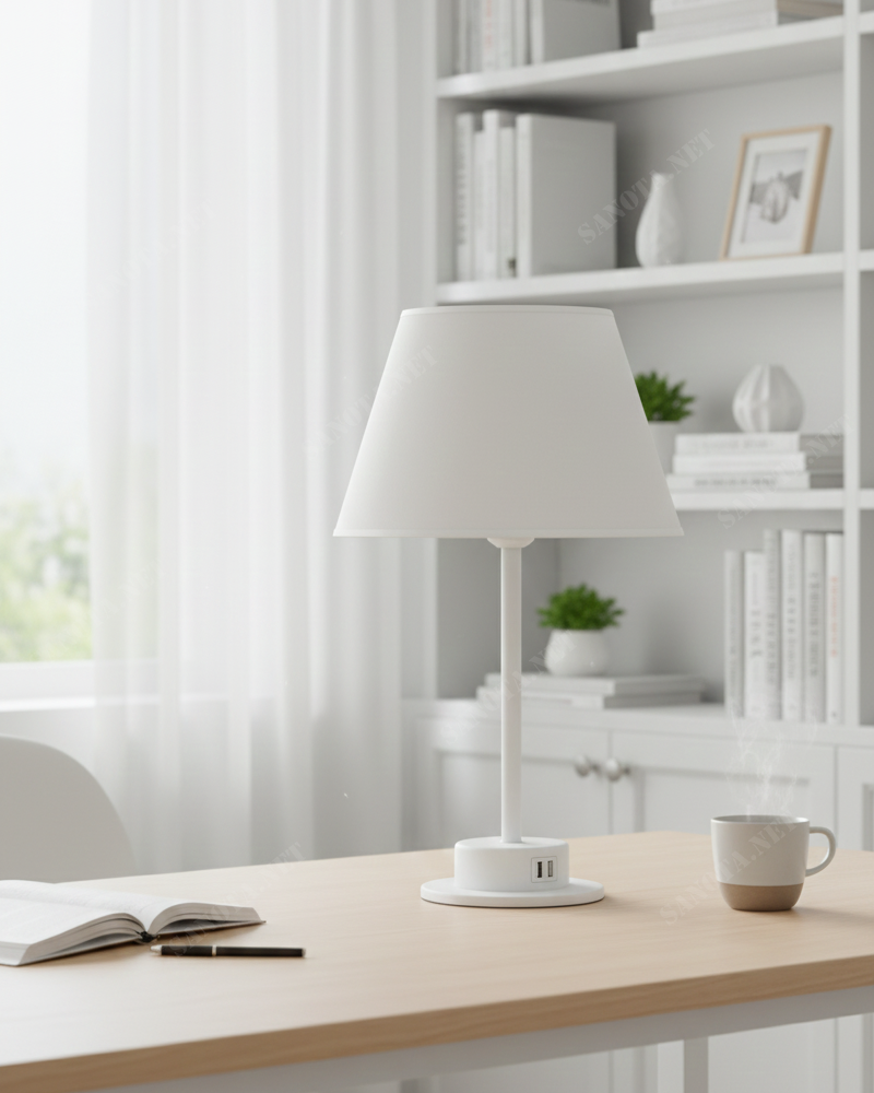 Thiết kế đèn bàn gồm chụp vải trắng hình loe mềm mại giúp ánh sáng tỏa đều, không gây chói mắt. Thân và đế đèn được hoàn thiện đồng bộ màu trắng, tạo tổng thể hài hòa và trang nhã. Đui E27 thông dụng, dễ thay bóng. Phần đế chắc chắn và tích hợp cổng sạc tiện lợi, đáp ứng tốt nhu cầu sử dụng hằng ngày.
