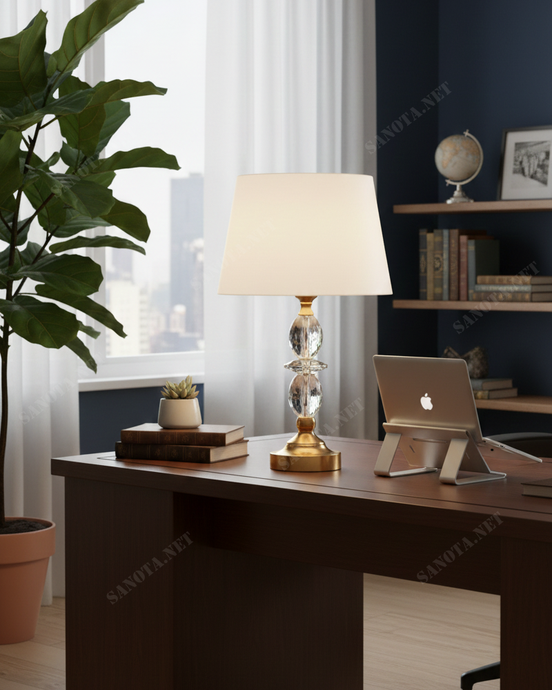 Phần thân đèn gây ấn tượng mạnh bởi hai khối pha lê lớn hình giọt nước được nối với nhau bằng các khớp kim loại mạ vàng sáng bóng. Tạo nên vẻ ngoài lấp lánh như những viên ngọc quý. Đế đèn tròn phẳng đảm bảo sự vững chãi trên mọi bề mặt. Đặc biệt, chiều cao 415mm của đèn rất lý tưởng để tạo ra một vùng sáng tập trung. Vừa đủ để phục vụ nhu cầu cá nhân mà không làm ảnh hưởng đến người xung quanh.