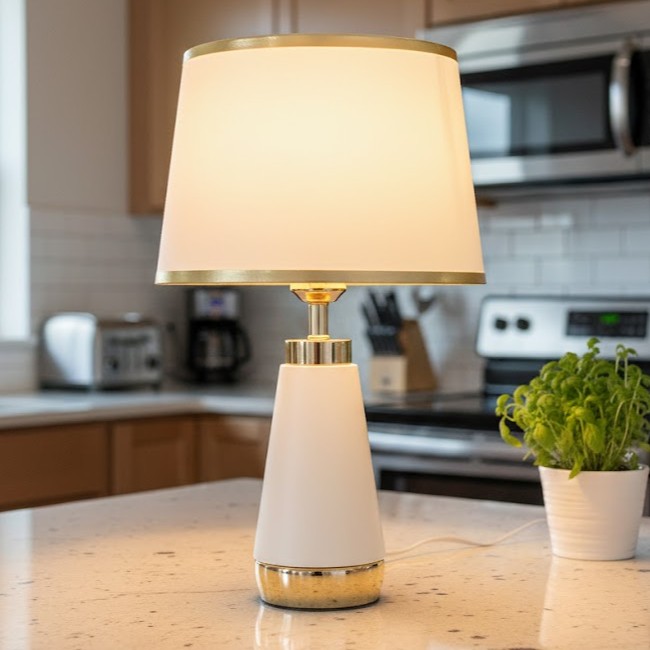 Đèn bàn trang trí chao vải ánh vàng sang trọng mang trong mình thiết kế hiện đại pha lẫn nét cổ điển, là lựa chọn hoàn hảo cho những ai yêu thích không gian sống tinh tế và ấm áp. Sản phẩm nổi bật với gam màu trắng ngọc tinh khôi kết hợp cùng viền vàng ánh kim, tạo nên vẻ đẹp thanh lịch, sang trọng nhưng không kém phần gần gũi.