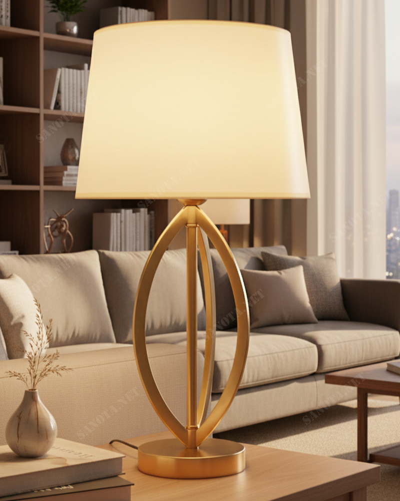 Đèn bàn trang trí được chế tác từ hợp kim cao cấp mạ màu vàng đồng satin. Mang lại vẻ đẹp mịn màng và không bám dấu vân tay. Cấu trúc hai vòng cung đối xứng không chỉ mang tính thẩm mỹ mà còn tạo ra sự ổn định tuyệt đối về mặt vật lý. Kết hợp với chụp đèn vải trắng cao cấp sử dụng đui E27. Bạn có thể dễ dàng thay thế các loại bóng LED với độ sáng và màu sắc tùy thích để phù hợp với tâm trạng của mình