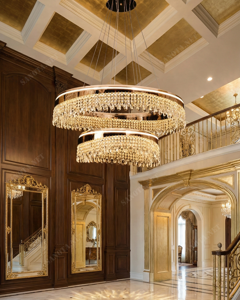 Đèn chùm pha lê vòng tròn đôi là mẫu đèn trang trí cao cấp mang vẻ đẹp sang trọng và hiện đại. Thiết kế hai tầng vòng pha lê kết hợp ánh sáng vàng ấm tạo nên điểm nhấn nổi bật cho không gian, phù hợp với phòng khách, sảnh lớn hoặc các không gian cần sự tinh tế.