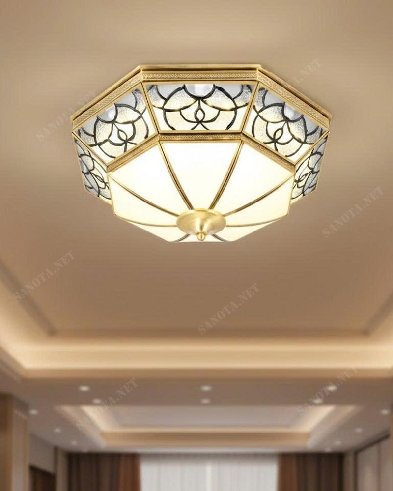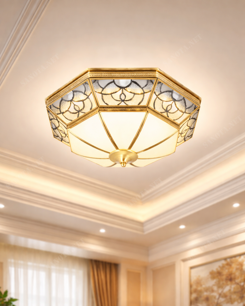 Đèn ốp trần được chế tác từ khung đồng cao cấp phủ màu vàng ấm, bền màu theo thời gian. Các mảng kính hoa văn mềm mại được ghép tỉ mỉ, giúp ánh sáng tỏa đều, dịu mắt và không gây chói. Công nghệ LED tích hợp tiết kiệm điện năng, cho ánh sáng ổn định và tuổi thọ cao. Kiểu dáng bát giác hài hòa giúp đèn phù hợp với nhiều phong cách nội thất, từ cổ điển đến bán cổ điển.