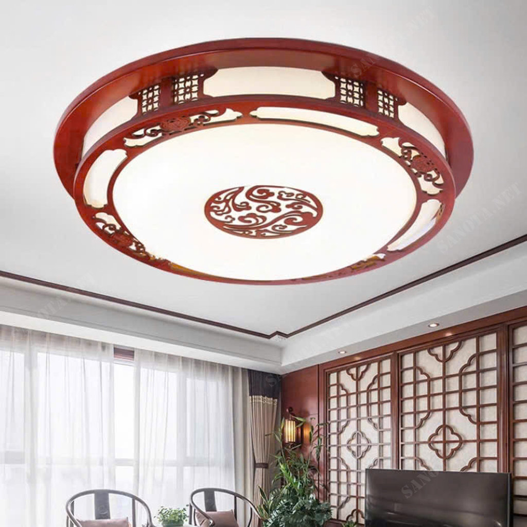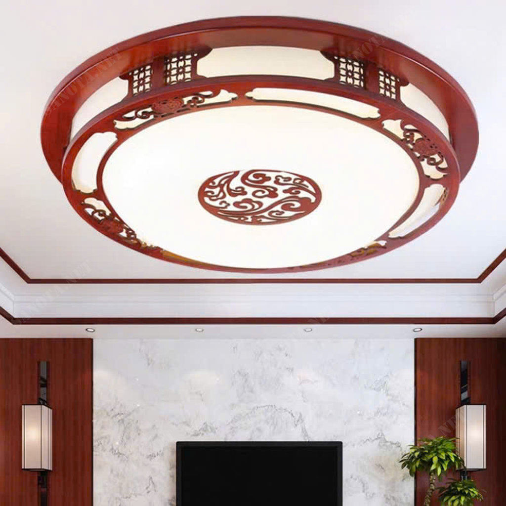 Đèn ốp trần gỗ cổ điển lấy cảm hứng từ kiến trúc cổ truyền, mẫu đèn sở hữu khung gỗ sơn đỏ nâu cùng hoa văn chạm khắc tỉ mỉ. Mặt đèn tròn mềm mại, ở giữa là họa tiết vân mây cách điệu, biểu tượng cho sự viên mãn và thịnh vượng.