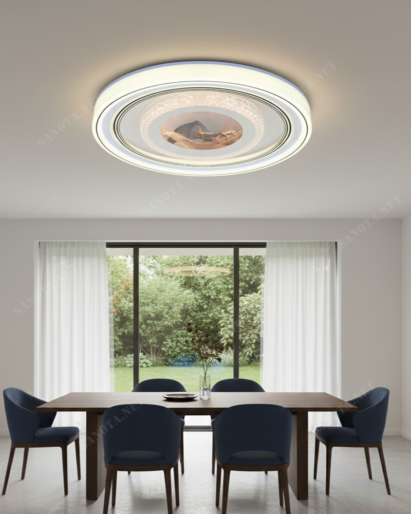 Sự kết hợp giữa ánh sáng trắng tinh khiết từ viền ngoài, sự lấp lánh của vòng pha lê và họa tiết hươu nghệ thuật ở trung tâm biến chiếc đèn này không chỉ là một nguồn sáng mà còn là một tác phẩm điêu khắc ánh sáng.