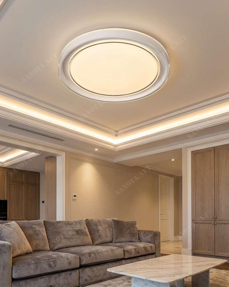 Điểm nhấn ấn tượng nhất của mẫu đèn ốp trần là về mặt cấu tạo, chiếc đèn có đường kính 400mm và độ dày cực mỏng chỉ 60mm. Giúp nó ôm sát vào bề mặt trần nhà một cách tinh tế.