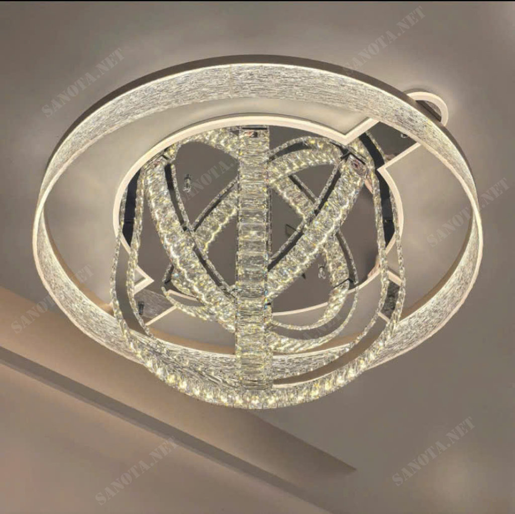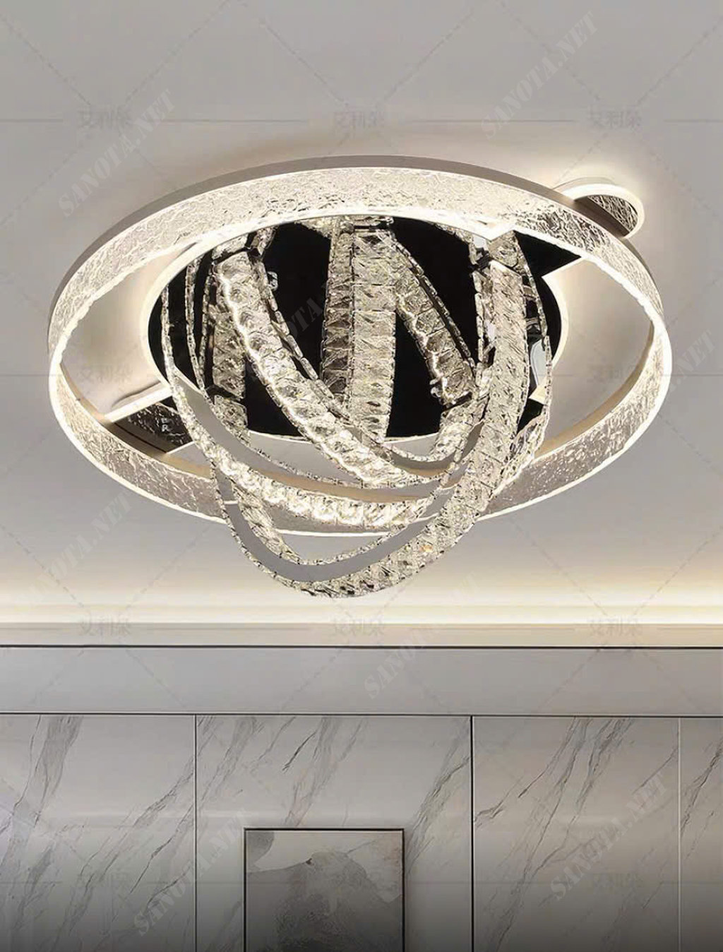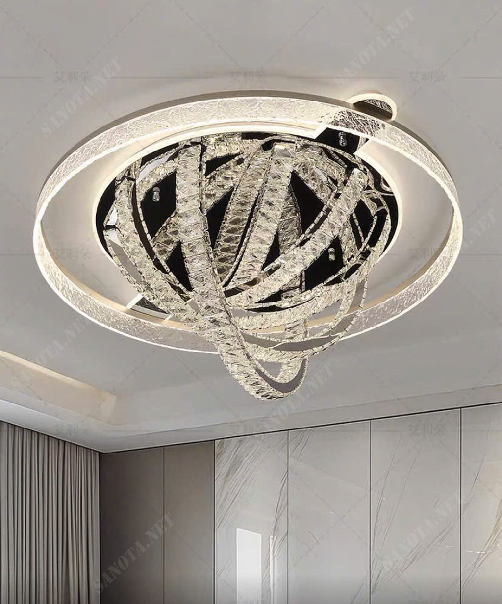 Chiếc đèn ốp trần hiện đại với thiết kế là vòng tròn lớn ốp trần bao bọc lấy khối pha lê xoắn ốc ấn tượng ở trung tâm. Chắc chắn sẽ là điểm nhấn ấn tượng cho bất kỳ không gian nào. Với việc sắp xếp các dải pha lê uốn lượn, đan xen một cách độc đáo và tinh tế, chiếc đèn tạo cảm giác như một thiên hà thu nhỏ lấp lánh.