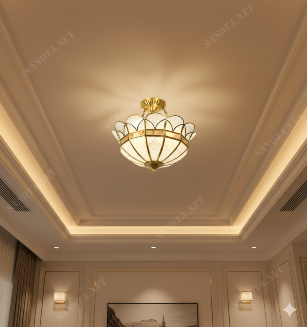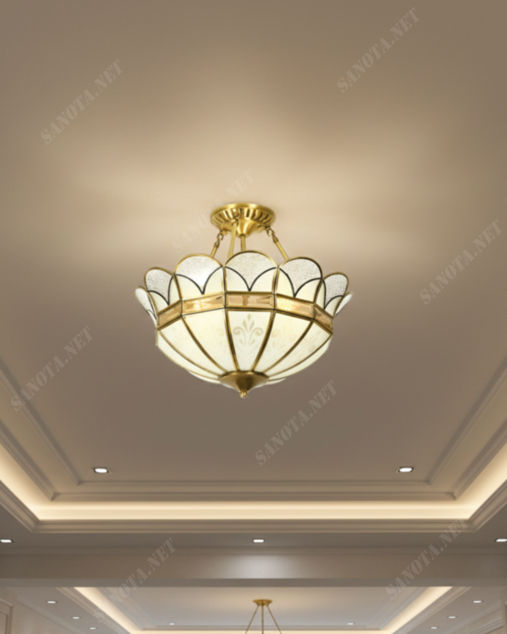 Đèn ốp trần phong cách hoàng gia SNT5904 sở hữu khung hợp kim đồng bền bỉ. Chất liệu cao cấp giúp chống oxy hóa và giữ màu sắc luôn sáng bóng. Chao đèn được chế tác từ thủy tinh mờ với họa tiết hoa văn nghệ thuật. Sự kết hợp này tạo nên vẻ đẹp huyền bí và quyền quý cho căn phòng. Các múi kính được ghép thủ công tỉ mỉ tạo hình như một bông hoa.