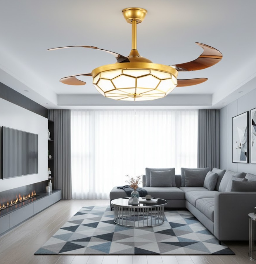 Chiếc quạt trần đèn này nổi bật với thân đèn mạ vàng đồng sang trọng, tạo điểm nhấn thu hút ánh nhìn. Phần chụp đèn được chế tác tinh xảo theo phong cách Châu Âu cổ điển, sử dụng chất liệu kính/mica cao cấp với hoa văn hình học độc đáo, giúp khuếch tán ánh sáng ấm áp và dịu mắt. Bốn cánh quạt được làm từ chất liệu gỗ tự nhiên hoặc composite giả gỗ cao cấp, không chỉ mang lại hiệu suất làm mát tối ưu mà còn tăng thêm nét ấm cúng, sang trọng. Đặc biệt, đây là mẫu quạt trần cánh cụp xòe thông minh, khi không sử dụng, cánh quạt sẽ thu gọn lại, biến chiếc quạt thành một chiếc đèn trang trí tuyệt đẹp.