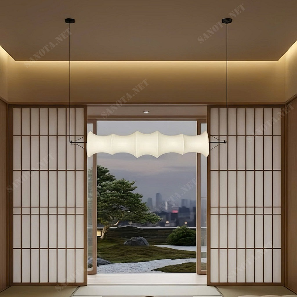 Đèn có hình dáng thanh dài, nhưng chụp đèn được tạo hình lượn sóng (hoặc xếp nếp), gợi nhớ đến vẻ đẹp của lụa hoặc giấy truyền thống, mang lại cảm giác mềm mại và nghệ thuật.