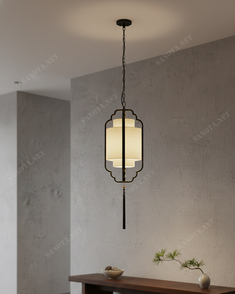 Chiếc đèn thả là một kiệt tác nội thất mang đậm hơi thở Á Đông đương đại. Với sự kết hợp tinh tế giữa khung đen huyền bí và chao vải trang nhã, chiếc đèn không chỉ là nguồn sáng mà còn là điểm nhấn nghệ thuật, mang lại vẻ đẹp sang trọng và bầu không khí ấm cúng cho không gian sống của bạn.