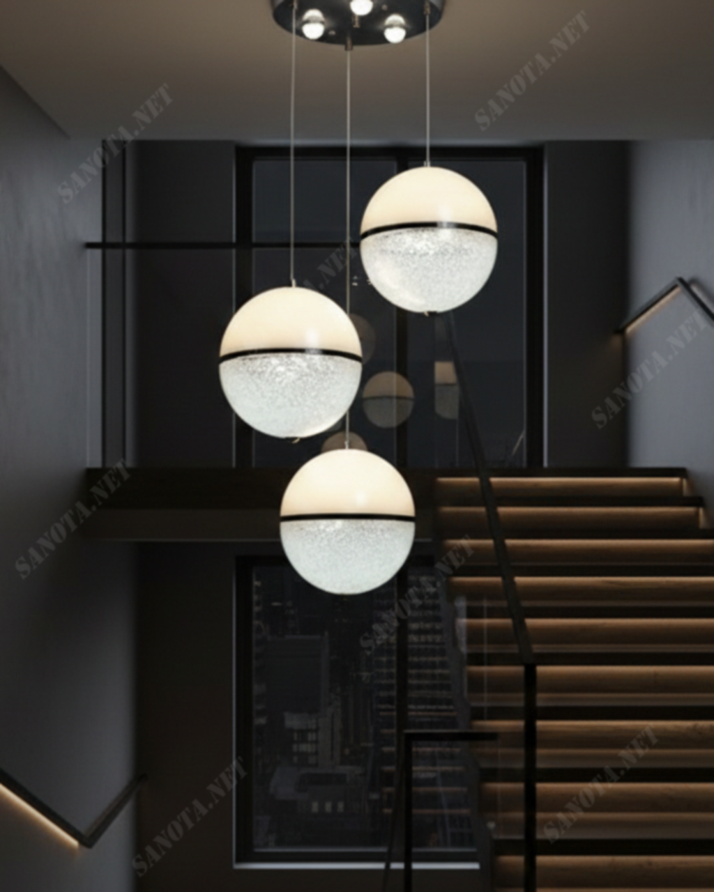 Đèn thả quả cầu lấp lánh SNT5796 có ba quả cầu treo thả cân đối, đẹp mắt. Chao đèn thủy tinh kết hợp hai phần vật liệu. Phần trên màu trắng đục tán quang ánh sáng đều dịu. Phần dưới là thủy tinh hiệu ứng lấp lánh, cực kỳ độc đáo.