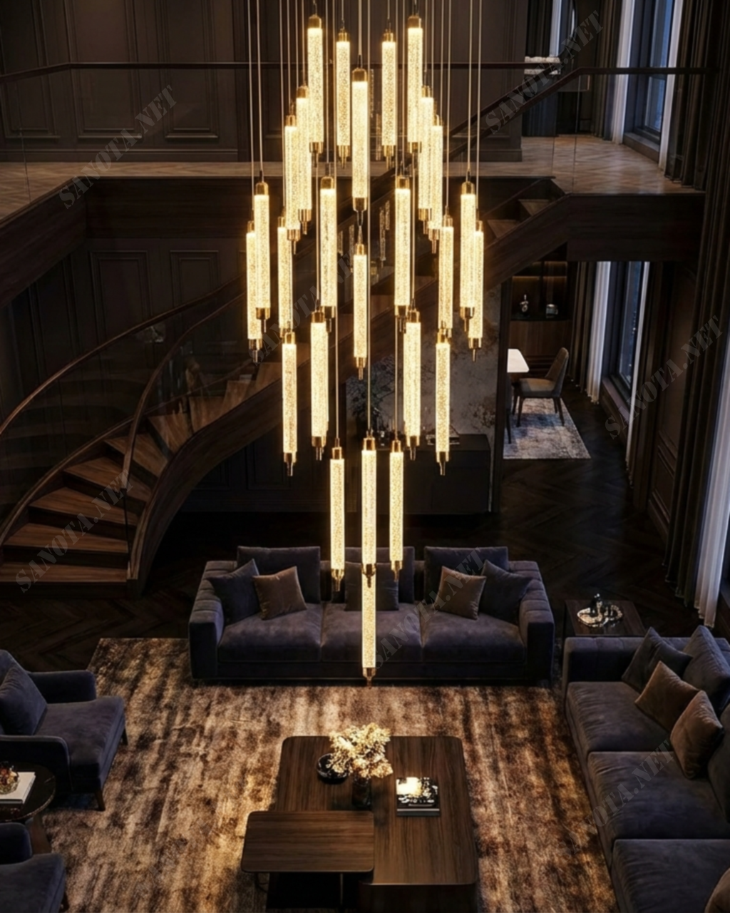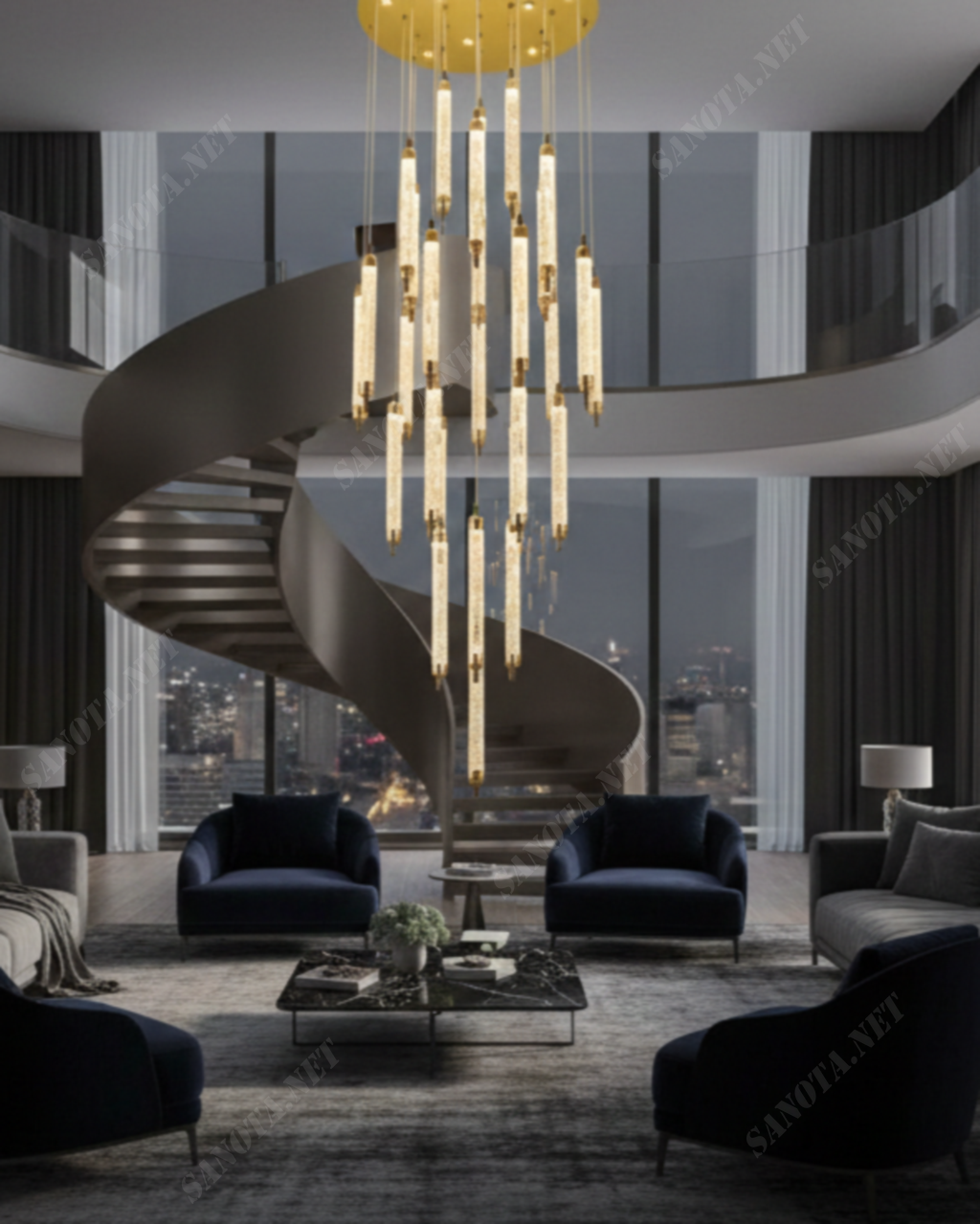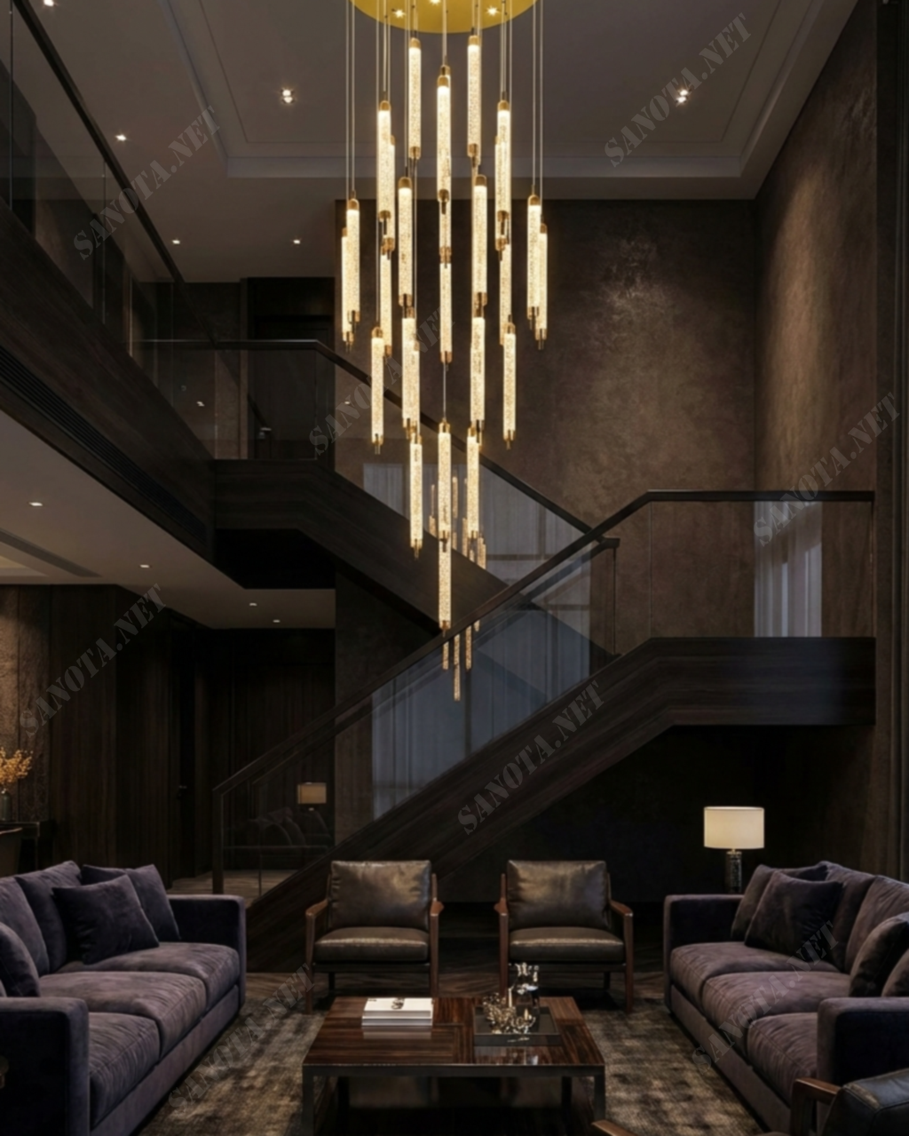 Các trụ đèn được sắp xếp so le, tạo hiệu ứng dòng thác ánh sáng đổ xuống. Chiều cao đèn lên đến 2500mm, phù hợp cho các không gian trần cao. Hệ thống dây treo chắc chắn giúp bạn yên tâm về độ an toàn khi sử dụng.
