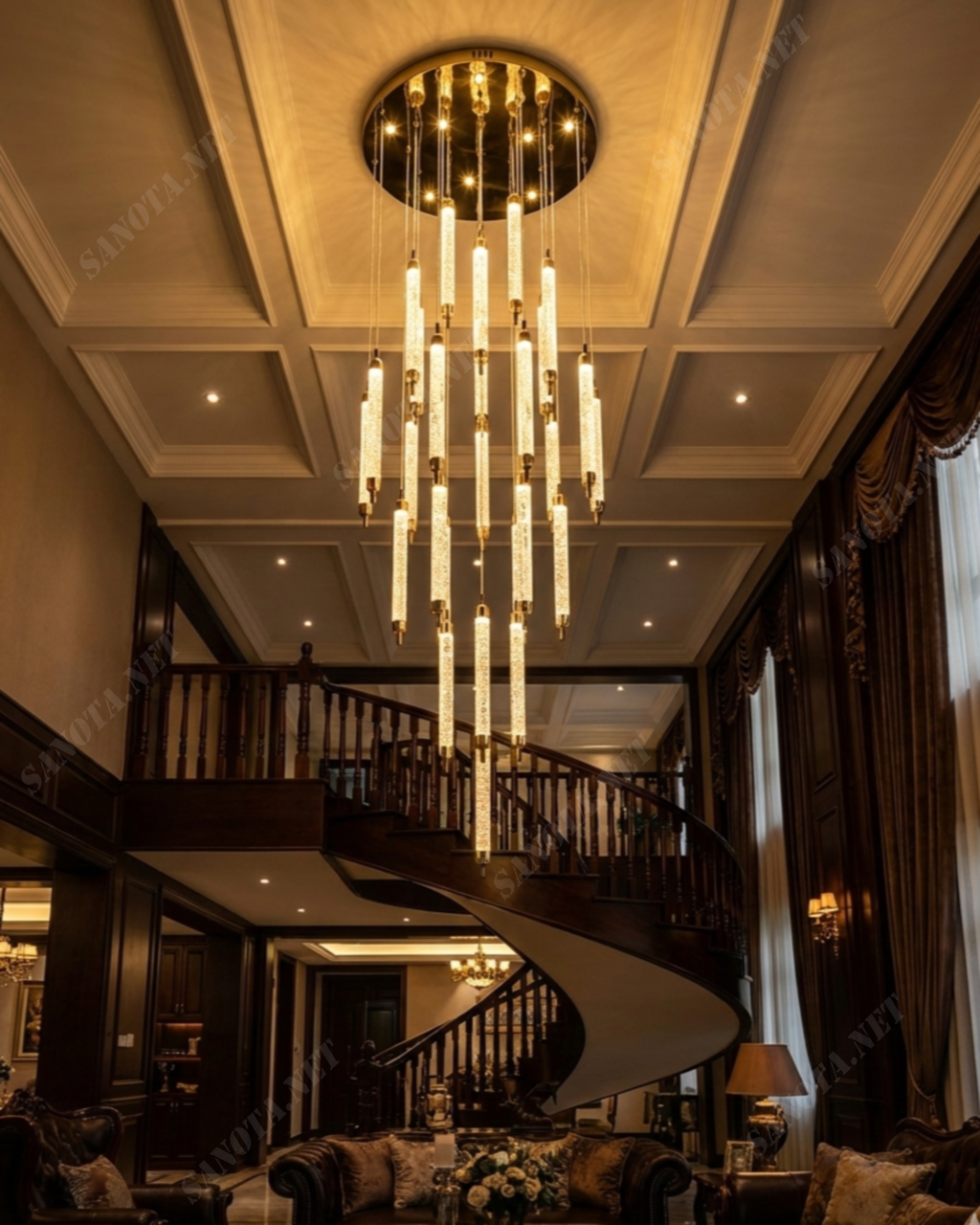 Mẫu đèn này là điểm nhấn hoàn hảo cho sảnh biệt thự hoặc khách sạn. Nó giúp không gian trở nên rộng mở và có chiều sâu hơn. Sản phẩm chắc chắn sẽ khiến khách tới chơi nhà phải trầm trồ khen ngợi. Hãy làm mới ngôi nhà bạn với đèn thả thông tầng trụ thủy tinh ngay hôm nay.
