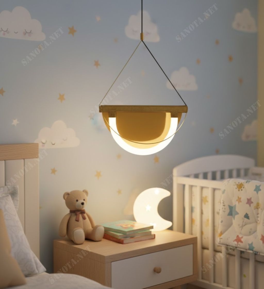 Đặc biệt, với những không gian dành cho trẻ nhỏ, mẫu đèn này không chỉ đóng vai trò chiếu sáng. Mà còn như một món decor trang trí mang tính kể chuyện, giúp căn phòng trở nên sinh động, ấm áp và đầy cảm hứng. Thiết kế bán nguyệt không góc cạnh, tạo cảm giác an toàn và thân thiện. Rất phù hợp với phong cách nội thất hiện đại, Scandinavian hoặc Japandi.