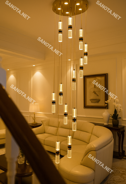 Đèn SNT5781 gây ấn tượng với ống pha lê uốn lượn mềm mại. Ánh sáng vàng ấm tạo hiệu ứng lung linh nổi bật. Mẫu đèn phù hợp cho khu vực cầu thang và phòng khách thông tầng. Bạn cũng có thể lắp tại sảnh hoặc không gian trần cao.