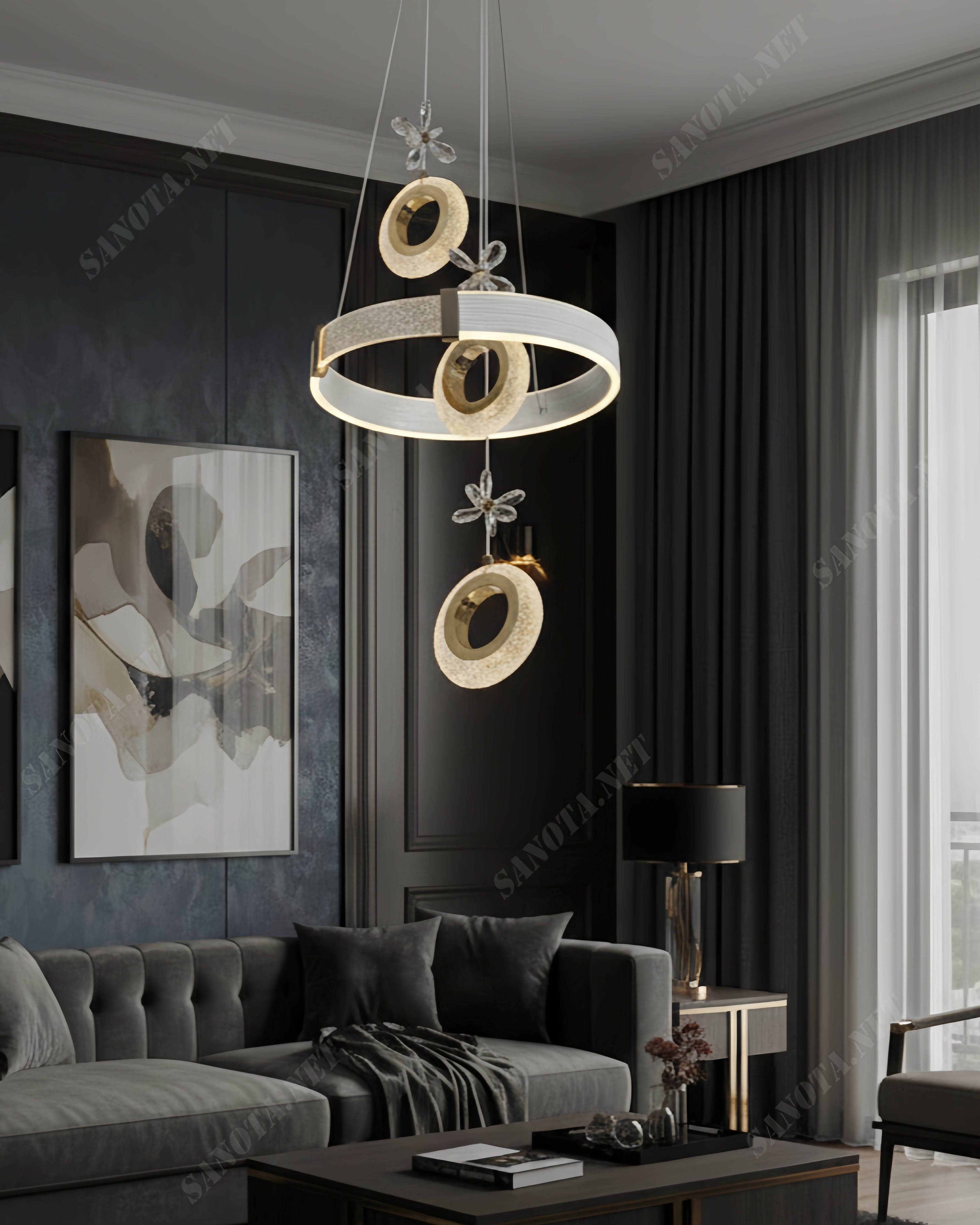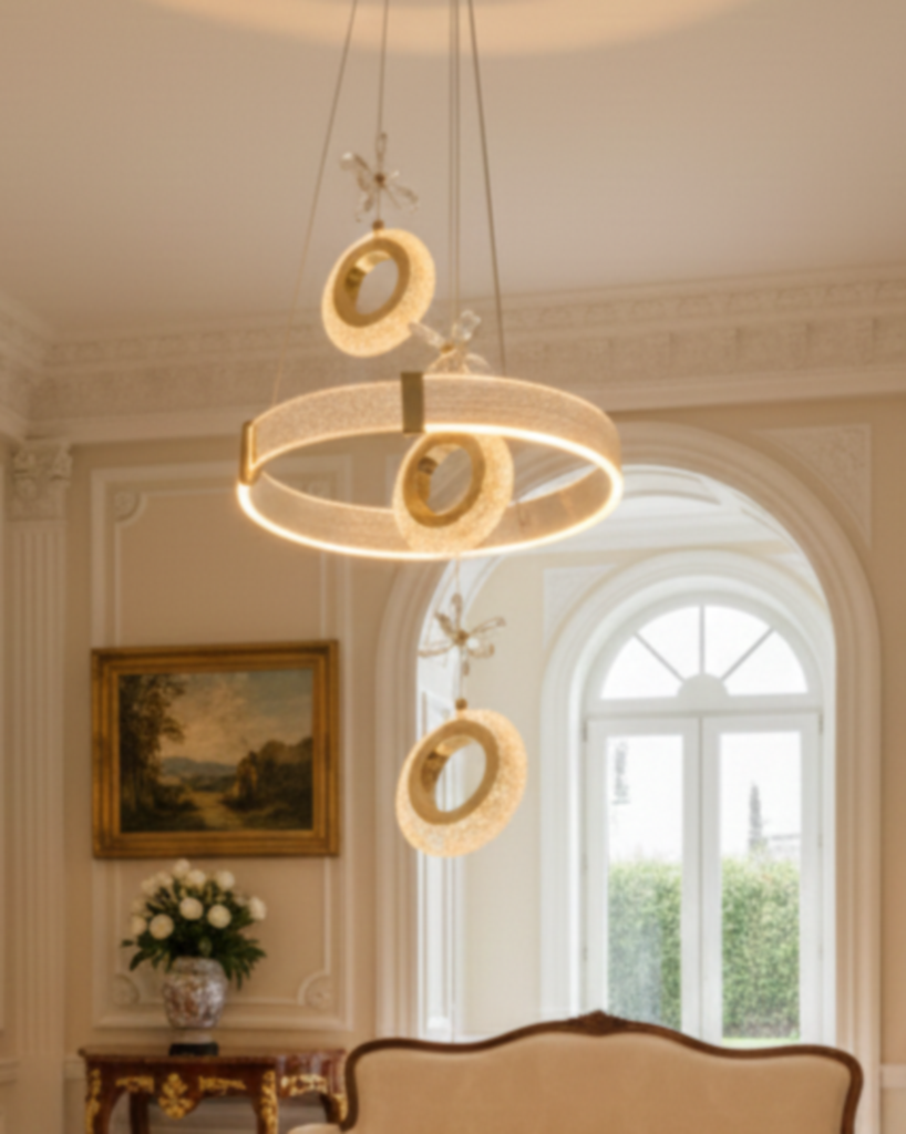 Đèn có cấu trúc gồm các vòng tròn kim loại đan xen với các vòng pha lê hoặc acrylic vân lấp lánh (vàng champagne). Ba vòng tròn liên kết theo bố cục thả tầng, uốn lượn mềm mại, thu hút mọi ánh nhìn. Đặc biệt, chi tiết pha lê hình cánh bướm tinh xảo treo giữa các vòng càng làm tăng thêm vẻ lung linh, duyên dáng.