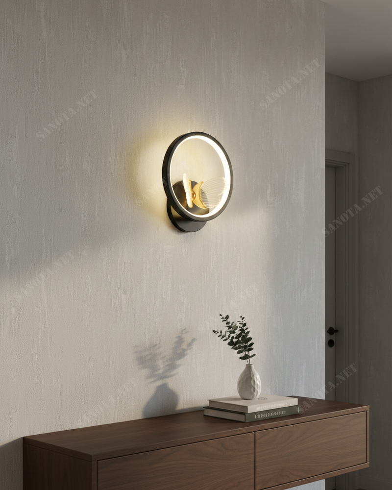 Mẫu đèn tường lấy cảm hứng từ vẻ đẹp mong manh và rực rỡ của loài bướm. Mang đến một làn gió thiên nhiên đầy nghệ thuật vào không gian sống. Hình ảnh đôi cánh bướm vươn ra từ một vòng tròn ánh sáng tạo cảm giác như sinh vật này đang đậu nhẹ nhàng trên bức tường nhà bạn.