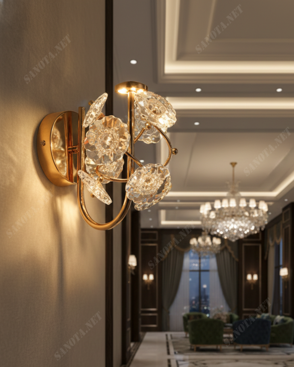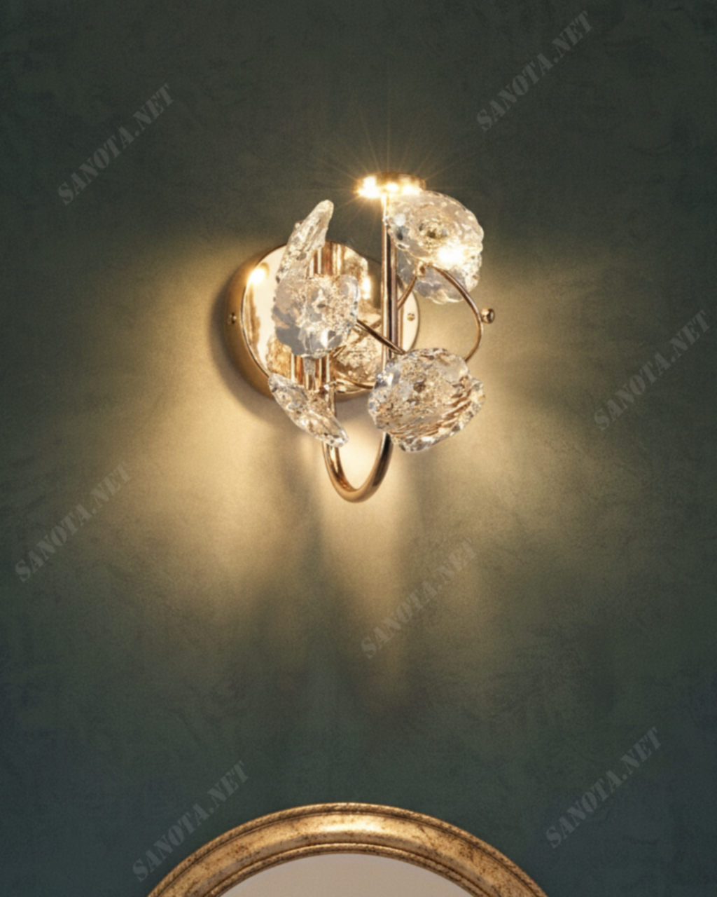 Đèn tường đóa hoa e ấp SNT5883 là lựa chọn hoàn hảo cho không gian nội thất cao cấp. Sản phẩm mang hình dáng những lá phổi pha lê tinh xảo đang ôm lấy nhụy hoa vàng. Khi thắp sáng, đèn tạo ra hiệu ứng lung linh như những giọt sương ban mai. Mẫu đèn này giúp nâng tầm đẳng cấp cho phòng khách, sảnh chờ hay phòng ngủ.