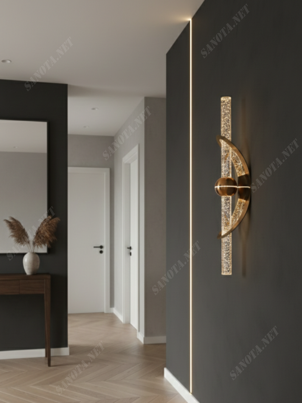 Đèn vừa chiếu sáng, vừa tạo điểm nhấn nghệ thuật cho bức tường. Phong cách hiện đại pha nét cổ điển đầy tinh tế. SNT6499 tôn vinh gu thẩm mỹ sang trọng của gia chủ.