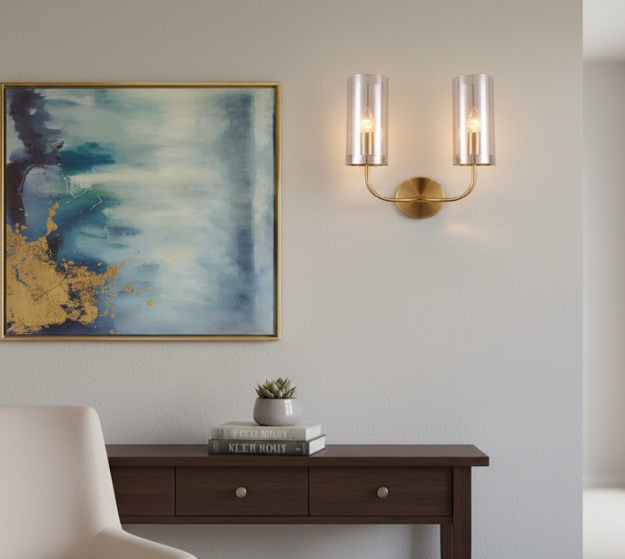 Đèn Tường Đôi Hiện Đại Tay Đồng, Chụp Thủy Tinh Trong Suốt – Nâng Tầm Không Gian Sống
