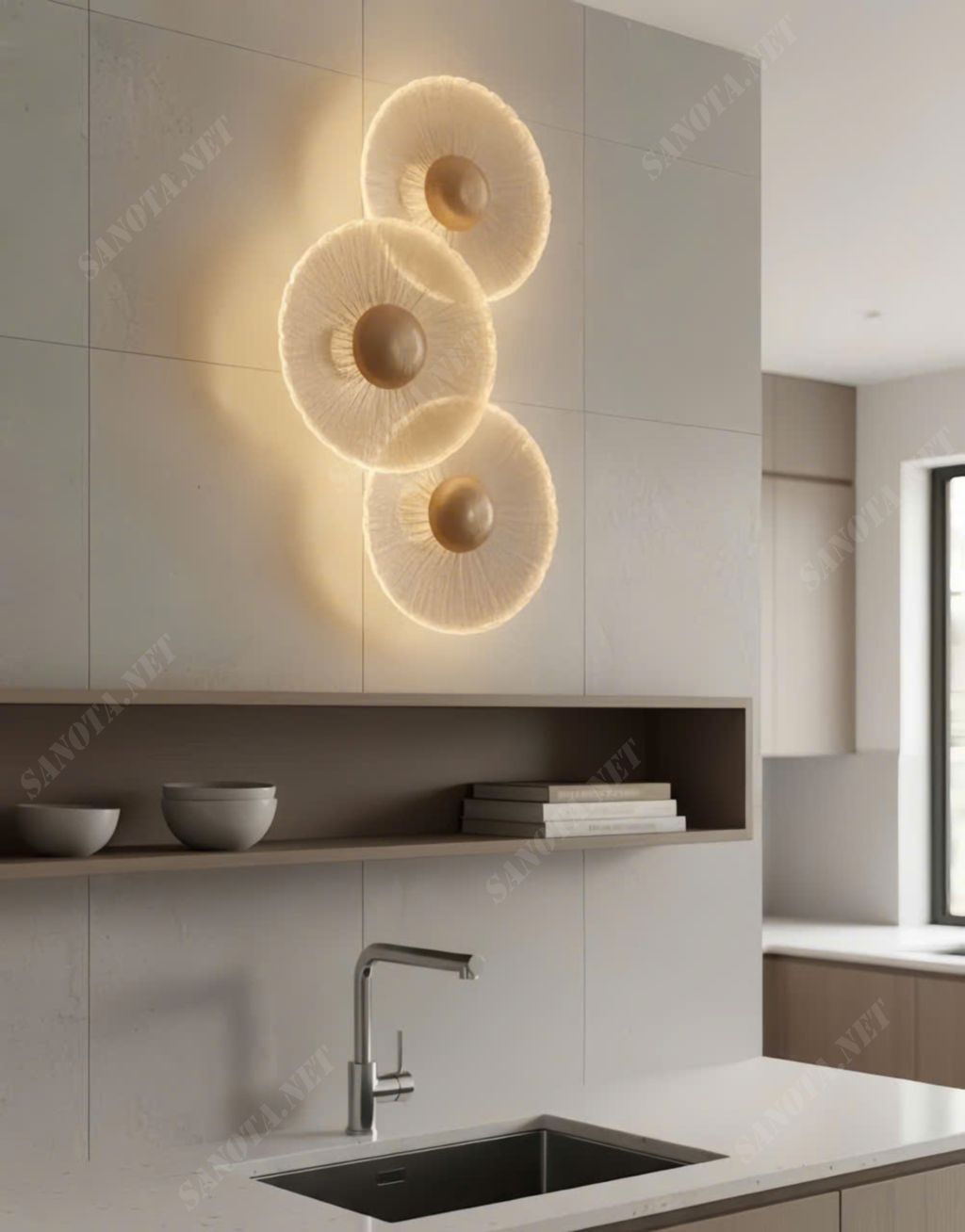 Lấy cảm hứng từ những đường tròn đồng tâm giao thoa, đèn được tạo thành từ ba đĩa ánh sáng xếp chồng lệch nhau. Tạo nên hiệu ứng thị giác độc đáo. Mỗi “đĩa” được thiết kế với họa tiết gân mảnh tinh tế. Giúp ánh sáng lan tỏa nhẹ nhàng, tạo chiều sâu và cảm giác chuyển động mềm mại trên bề mặt tường.