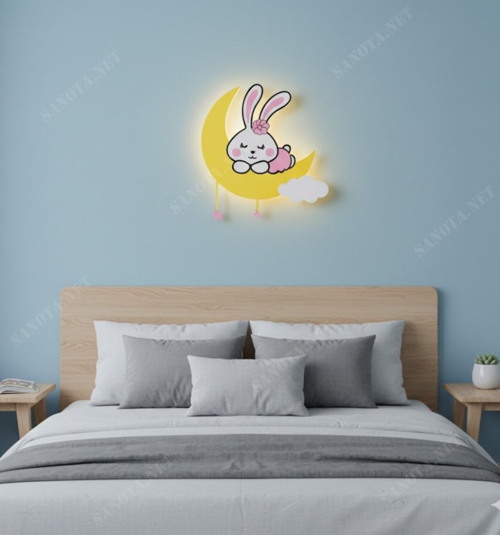 Mẫu đèn tường ngủ hình thỏ mang phong cách hiện đại với tạo hình ngộ nghĩnh, đáng yêu và dễ thương, rất thích hợp cho phòng trẻ em. Đèn được thiết kế với hình ảnh chú thỏ trắng đang nằm ngủ trên vầng trăng vàng. Kết hợp các chi tiết như ngôi sao treo và đám mây trang trí tạo nên một khung cảnh dịu dàng, mộng mơ. Ánh sáng phát ra từ đèn dịu nhẹ, không gây chói mắt, giúp tạo cảm giác thư giãn, an toàn cho trẻ khi ngủ.