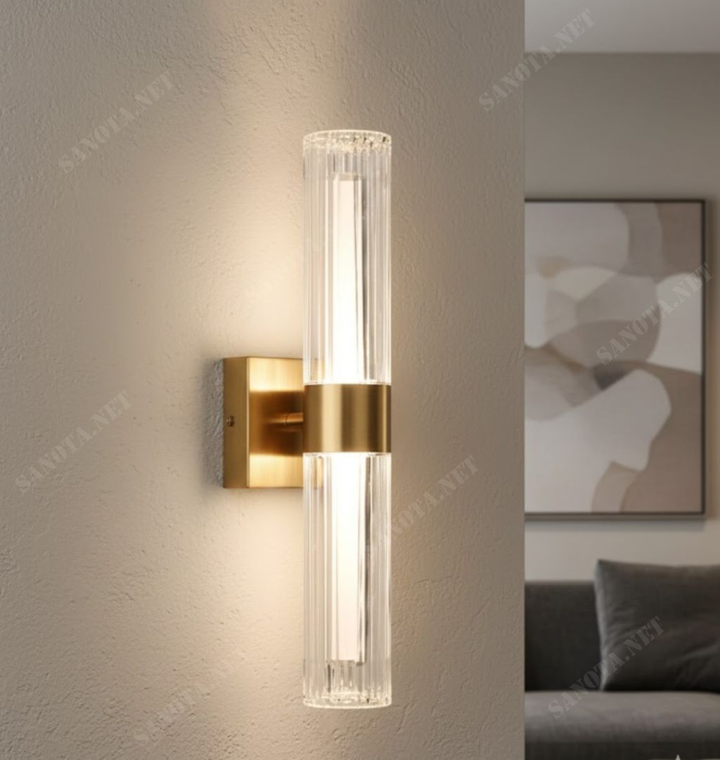 Đèn sở hữu form dáng trụ đứng đôi, tạo bố cục cân bằng và hài hòa. Thân đèn được cấu tạo từ ống pha lê trong suốt, bề mặt khía rãnh dọc tinh tế. Giúp ánh sáng phản xạ lấp lánh như giọt thủy tinh tan giữa không gian. Phần đế và khớp nối sử dụng kim loại mạ vàng mờ, tăng cảm giác sang trọng mà vẫn giữ được sự tinh gọn hiện đại.