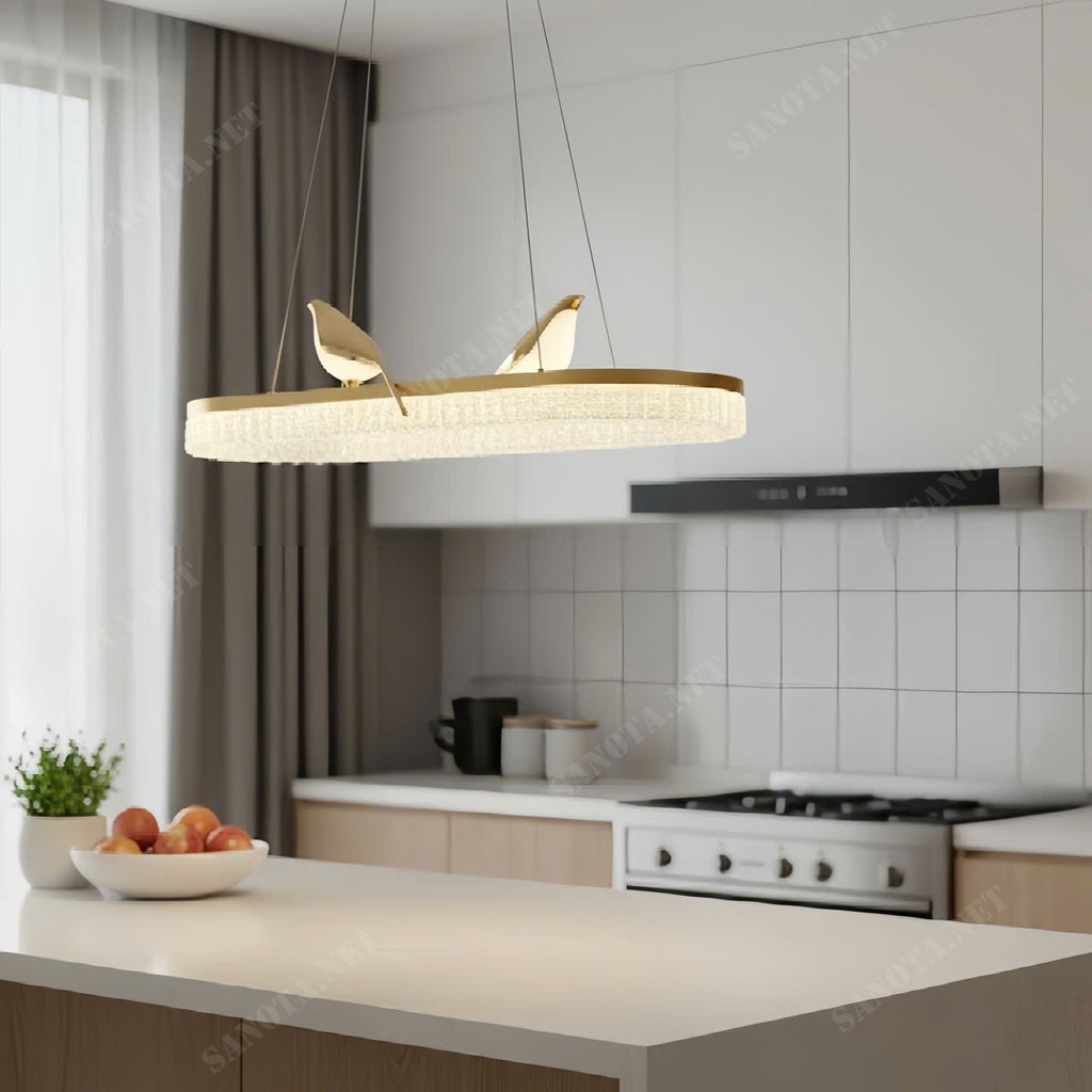 Đèn chùm bàn ăn mang phong cách tối giản nhưng đầy tinh tế, kết hợp hoàn hảo giữa khung kim loại sơn tĩnh điện và chi tiết chim trang trí ánh vàng sang trọng.